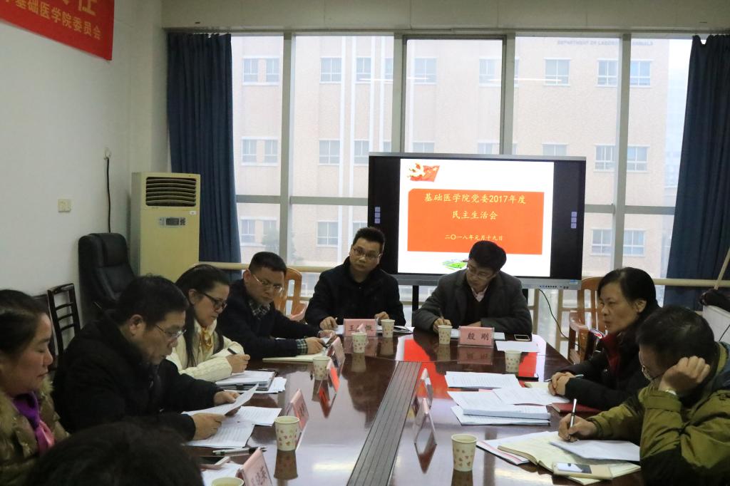 会上,院党委书记黄菊芳代表领导班子汇报了基础医学院2016年民主生活会和中央巡视后查摆问题的整改落实情况,并代表领导班子进行了对照检查发言。报告了学院领导班子在学习贯彻习近平新时代中国特色社会主义思想、认真执行党中央决策部署和上级党委决议决定、对党忠诚老实、担当负责,攻坚克难、纠正“四风”、严格执行廉洁自律准则等方面存在的突出问题、原因分析以及努力方向。随后,学院领导班子成员联系个人实际并紧密结合征求到的意见和建议,按照民主生活会的要求认真开展批评与自我批评。