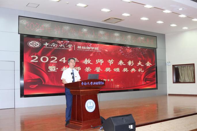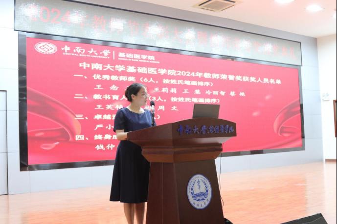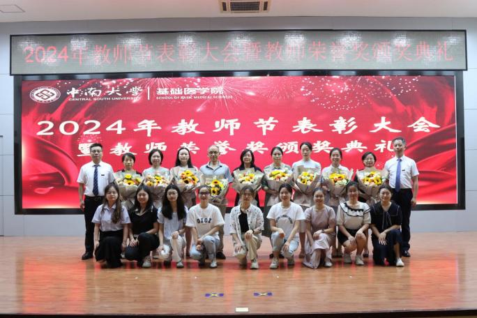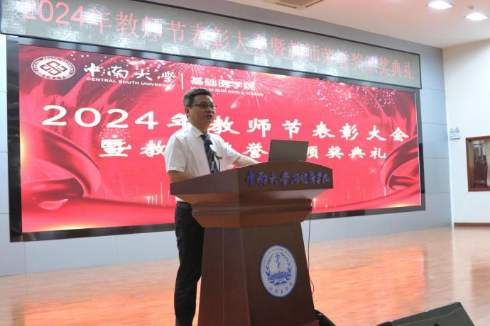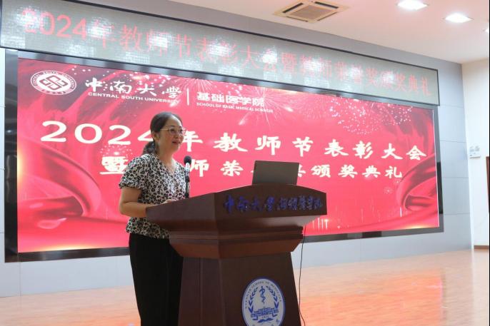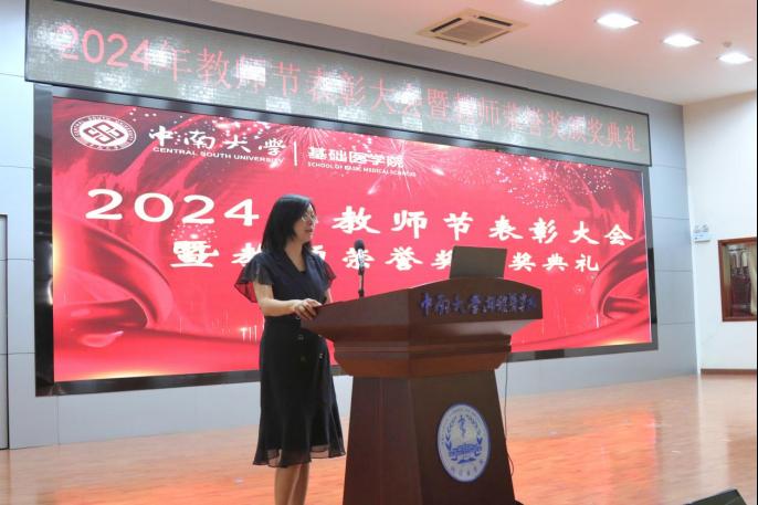 为全面贯彻习近平总书记关于教育工作的重要论述,有效落实《中共中央、国务院关于弘扬教育家精神加强新时代高素质专业化教师队伍建设的意见》,进一步加强我院教师队伍建设,厚植尊师重教文化,9月10日上午,我院在湘雅新校区图书馆学术报告厅举行2024年教师节表彰大会暨教师荣誉奖颁奖典礼,会议由院党委冯虹副书记主持,学院领导、教职员工和学生代表参加会议。