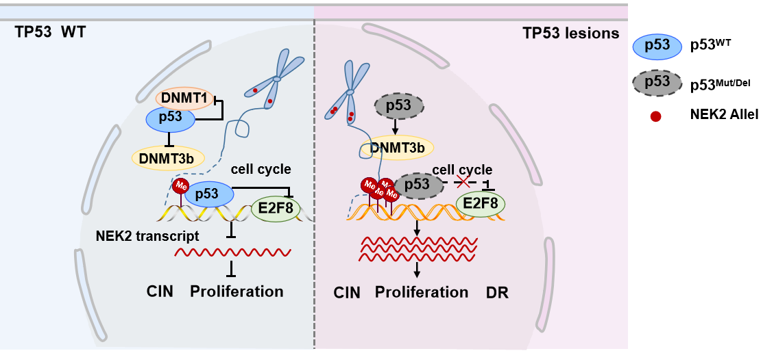 在前期研究基础上,本研究阐明了NEK2高表达的原因主要为DNA拷贝数增加和远端启动子区TP53结合位点处的甲基化所致。通过大样本数据分析发现同时伴有NEK2高表达与TP53丢失的MM患者预后最差。体内外实验进一步发现伴有NEK2与TP53“双打击”遗传变异的MM细胞恶性增殖程度高和对药物反应不敏感,其分子机制主要为 TP53的丢失一方面可以诱导染色体不稳定性的发生,例如NEK2所在染色体区段的扩增;另一方面可以上调DNMTs的表达,促使NEK2启动子区域甲基化,TP53介导的转录抑制复合物无法结合,从而促进NEK2的表达;反之在TP53丢失的肿瘤细胞系中恢复TP53表达或干预NEK2可以减缓肿瘤细胞增殖和增强其对临床用药硼替佐米敏感性。该研究为缓解TP53丢失的MM及其他肿瘤患者的临床耐药提供了新的治疗靶点。