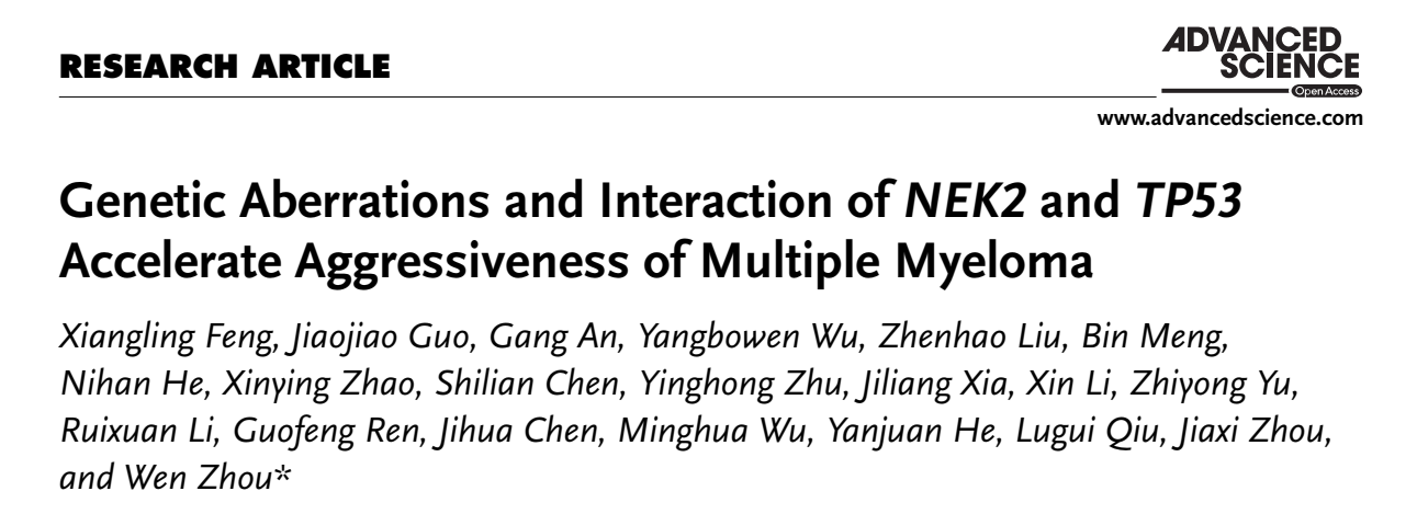 2022年1月27日,永兴集团官网肿瘤研究所周文课题组在国际知名学术期刊《Advanced Science》 (IF:16.8)杂志在线发表最新成果“Genetic Aberrations and Interaction of NEK2 and TP53 Accelerate Aggressiveness of Multiple Myeloma”论文。