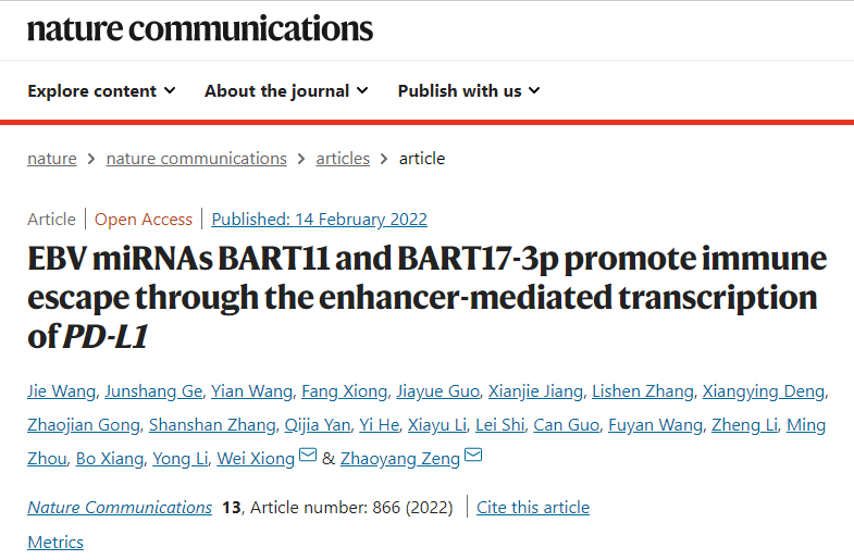 2022年2月14日,永兴集团官网肿瘤研究所熊炜、曾朝阳团队在Nature Communications杂志发表了题为“EBV miRNAs BART11 and BART17-3p promote immune escape through the enhancer-mediated transcription of PD-L1”的论文。