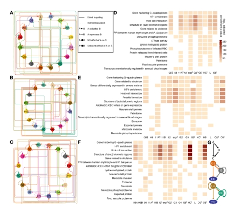 恶性疟原虫生活史复杂,需历经人和雌性按蚊两个宿主,为了在不同环境下生存,进化出一套与宿主相适应的基因表达调控机制。本研究着眼于恶性疟原虫主要病理阶段——红细胞内无性繁殖期(环状体、滋养体和裂殖体期),通过CRISPR/Cas9基因编辑技术,对恶性疟原虫最大的转录因子家族:ApiAP2转录因子,进行染色质免疫共沉淀联合高通量测序(ChIP-seq)筛选,首次绘制出ApiAP2转录因子家族全基因组分布图谱,系统性揭示了ApiAP2转录因子对异染色质基因和常染色质基因不同的调控机制。在此基础上,通过破坏部分ApiAP2转录因子的基因完整性获得敲除虫株,结合动态转录本变化及ChIP-seq数据,发现恶性疟原虫ApiAP2家族具有极为复杂的内部调控网络,广泛存在正反馈(Feedforward loop)、负反馈(Feedback loop)及自我调节(Autoregulation)等调控方式。因此,该研究不仅为疟原虫表观遗传调控机制研究提供了重要的数据资源,还为抗疟药物的研发提供了新的靶点。