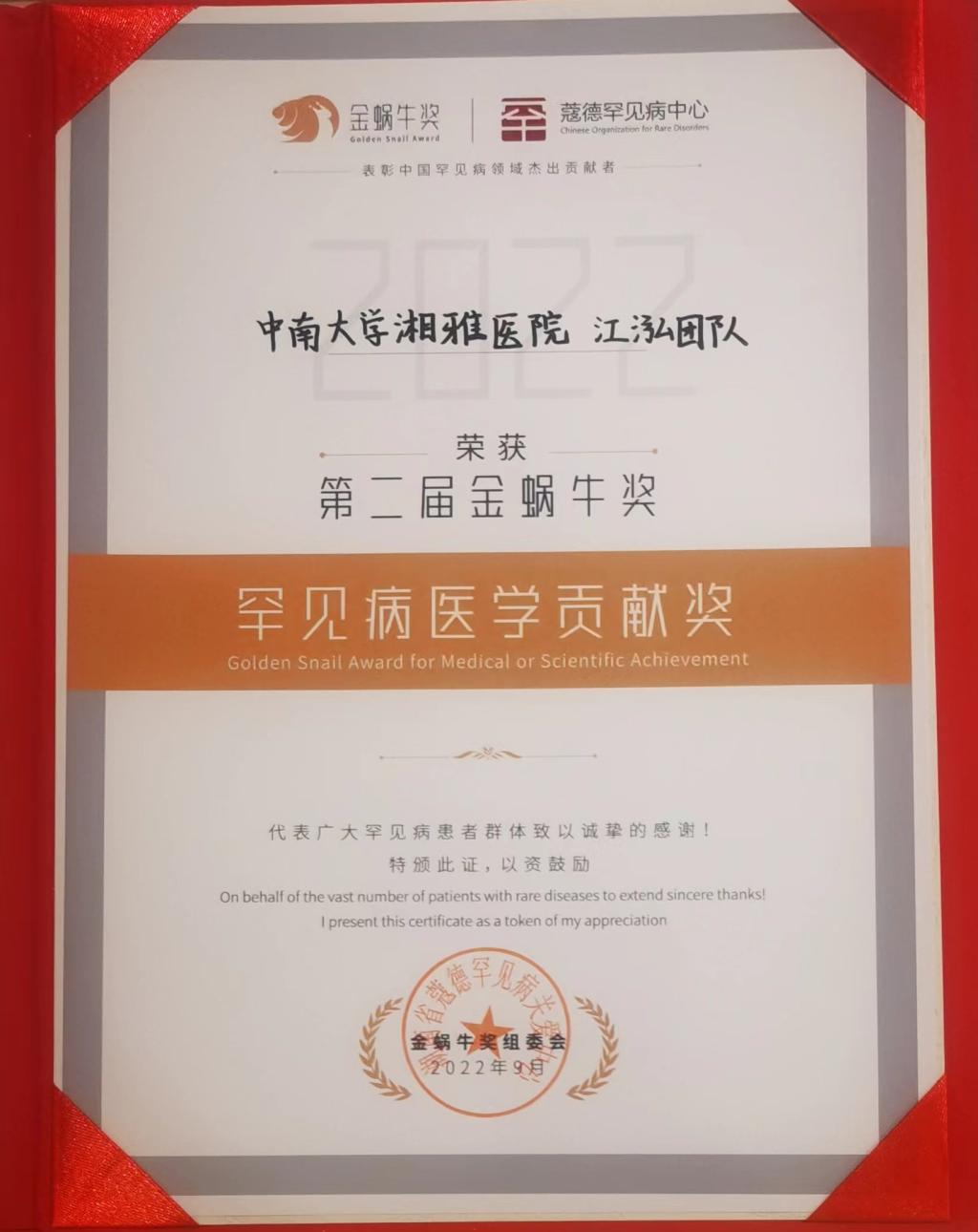 2022年9月2日晚,第二届“金蜗牛奖”颁奖典礼在上海隆重举行。永兴集团官网院长、湘雅医院神经内科江泓教授团队荣获“罕见病医学贡献奖”。