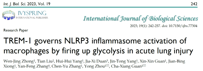 近日,永兴集团官网管茶香教授团队在国际学术期刊International Journal of Biological Sciences上在线发表了题为“TREM-1 governs NLRP3 inflammasome activation of macrophages by firing up glycolysis in acute lung injury(TREM-1通过诱导巨噬细胞糖代谢重编程活化NLRP3炎症小体加重急性肺损伤)”的研究论文。该论文以缺氧诱导因子-1α(HIF-1α)为切入点,从糖代谢重编程的全新视角探讨髓样细胞表达的触发受体-1(TREM-1)激活在诱导巨噬细胞NLRP3炎症小体中的作用,丰富了急性肺损伤/急性呼吸窘迫综合征(ALI /ARDS)炎症级联放大的分子机制。永兴集团官网为第一及通讯作者单位,管茶香教授和周勇副教授为共同通讯作者,博士生钟文静为第一作者。