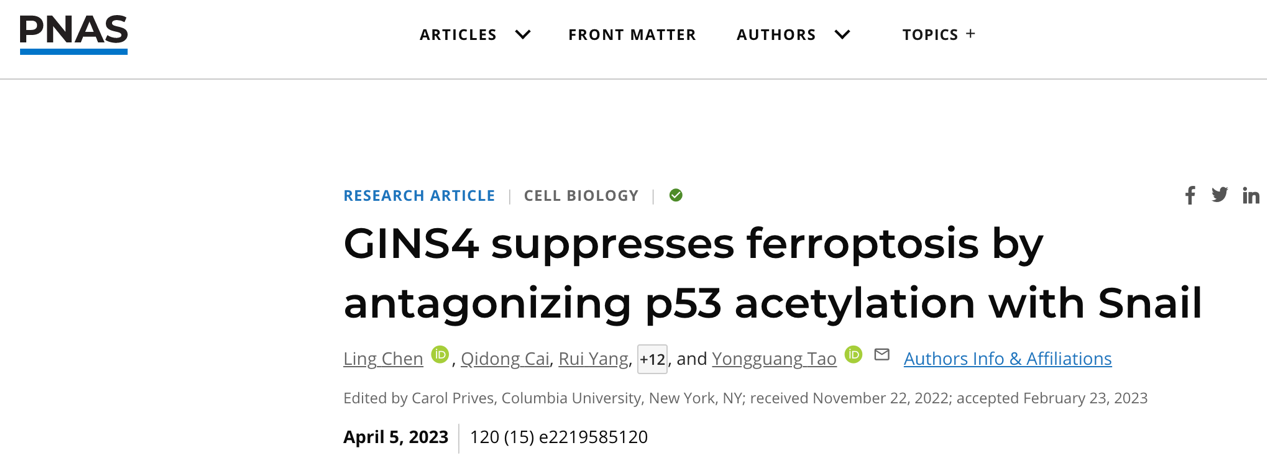 4月5日上述成果在《美国科学院院报》(Proceedings of the National Academy of Sciences of the United States of America,PNAS)在线发表。陶永光研究员以及湘雅医院医学研究中心研究员刘双为本论文的共同通讯作者,永兴集团官网肿瘤所实验师陈玲为第一作者。该论文审稿人一致认为,这是一项具有创新性的研究。研究者证实GINS4可作为一种潜在的新型诱导肿瘤细胞铁死亡的靶标,联合针对细胞周期G2/M期的放化疗药物,可增加肿瘤治疗效果。