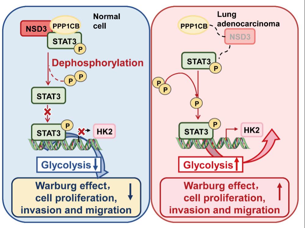 在美国乃至全球范围内,肺癌仍然是癌症相关死亡的主要原因。肺腺癌(LUAD)是一种常见的肺癌亚型,其发生率约占肺癌病例中的40%。为了满足肿瘤细胞的生长需要,能量代谢经常发生变化,其特点是即使在有氧条件下,肿瘤细胞也倾向于通过糖酵解获得ATP,这也被称为Warburg效应。组蛋白甲基转移酶NSD3位于8p11.2,能够促进H3K36位点的甲基化。既往研究已表明NSD3在大多数肿瘤中发挥了必要的表观遗传调控机制,但NSD3是否参与肺腺癌的发生发展尚不清楚。