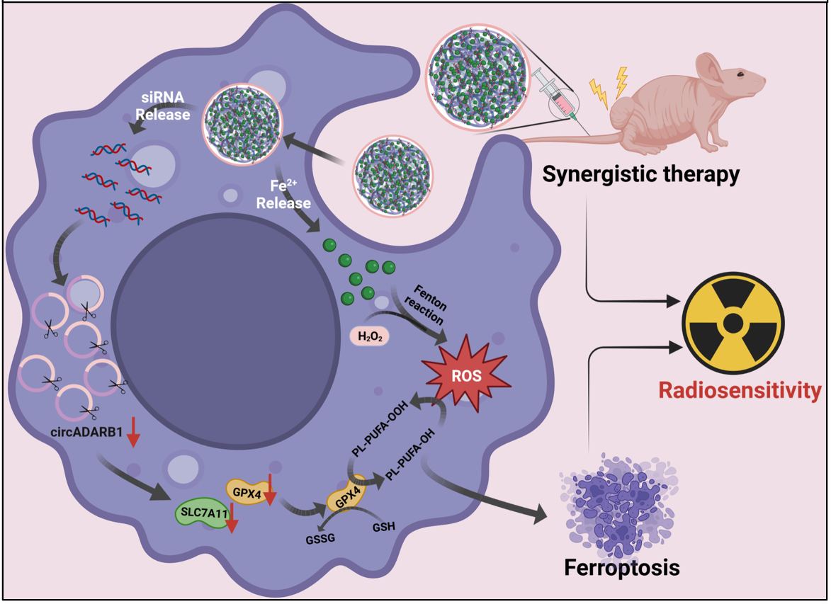 鼻咽癌是中国南方地区最常见的头颈部恶性肿瘤之一,每年全世界约一半的鼻咽癌患者在中国确诊,放射治疗是鼻咽癌临床首选方案,放疗抵抗机制及放疗增敏方案一直是鼻咽癌基础和临床研究领域重要的科学问题。本文发现一个环状RNA分子circADARB1在鼻咽癌组织中表达显著上调,并与患者不良预后密切相关;体内外实验证实circADARB1通过抑制铁死亡从而诱导鼻咽癌细胞对放疗的耐受。基于这些发现,该团队合成了一种由细胞膜包裹的半导体聚合物纳米材料,用于同时递送铁离子和靶向抑制circADARB1表达的siRNAs序列,协同诱导细胞铁死亡,增强了鼻咽癌放疗敏感性。