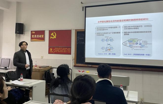 在本次讲座中,刘教授讲述了蛋白甲基化修饰(甲基化酶和去甲基化酶)调控基因表达促乳腺癌的机制及其小分子抑制剂的研究,让我们理解到了蛋白质的甲基化修饰就像其磷酸化、泛素化修饰功能一样重要。同时也让同学们了解到拥有夯实的基础知识对重大科学研究发现具有非常重要的作用。报告期间,刘教授幽默风趣的表现让同学们体会到了科研过程中有艰辛也有喜悦,科研生涯中是“痛并快乐着”的。报告结束后,老师及同学们就各种疑问与刘教授进行了热烈的探讨交流,如蛋白甲基化组学/修饰组学的发展前景、蛋白质单、双、三甲基化后对其结构的影响。
