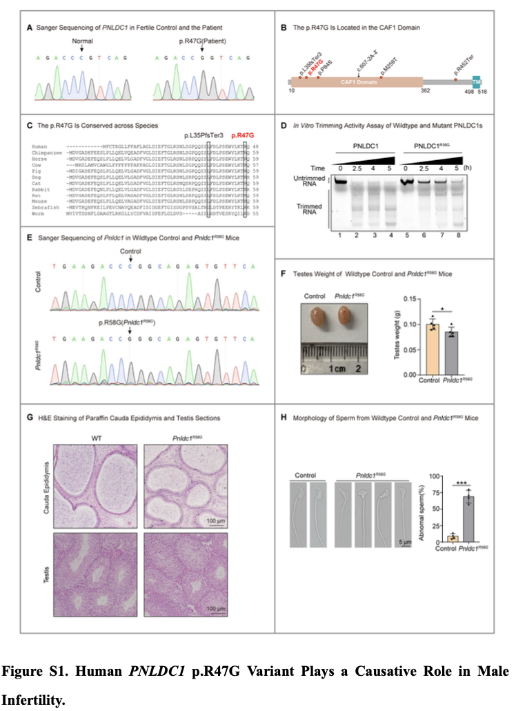 2022年4月28日,谭跃球教授与中国科学院上海生物化学与细胞生物研究所刘默芳教授团队合作,在N Engl J Med在线发表题为“DefectivepiRNA Processing and Azoospermia”的通讯论文。该研究发现了一种新型PNLDC1基因突变p.R47G,导致人类的严重少精子症,完全模拟人类的点突变小鼠有完全相同的表型,体外细胞实验显示该突变极大损害了PNLDC1的外切酶活性,证明了该突变在人类男性不育症中的因果作用。该研究结果丰富了PNLDC1 基因突变的临床表型,是对丹麦Almstrup团队研究的重要补充,进一步确实了PNLDC1在精子发生中的重要作用。