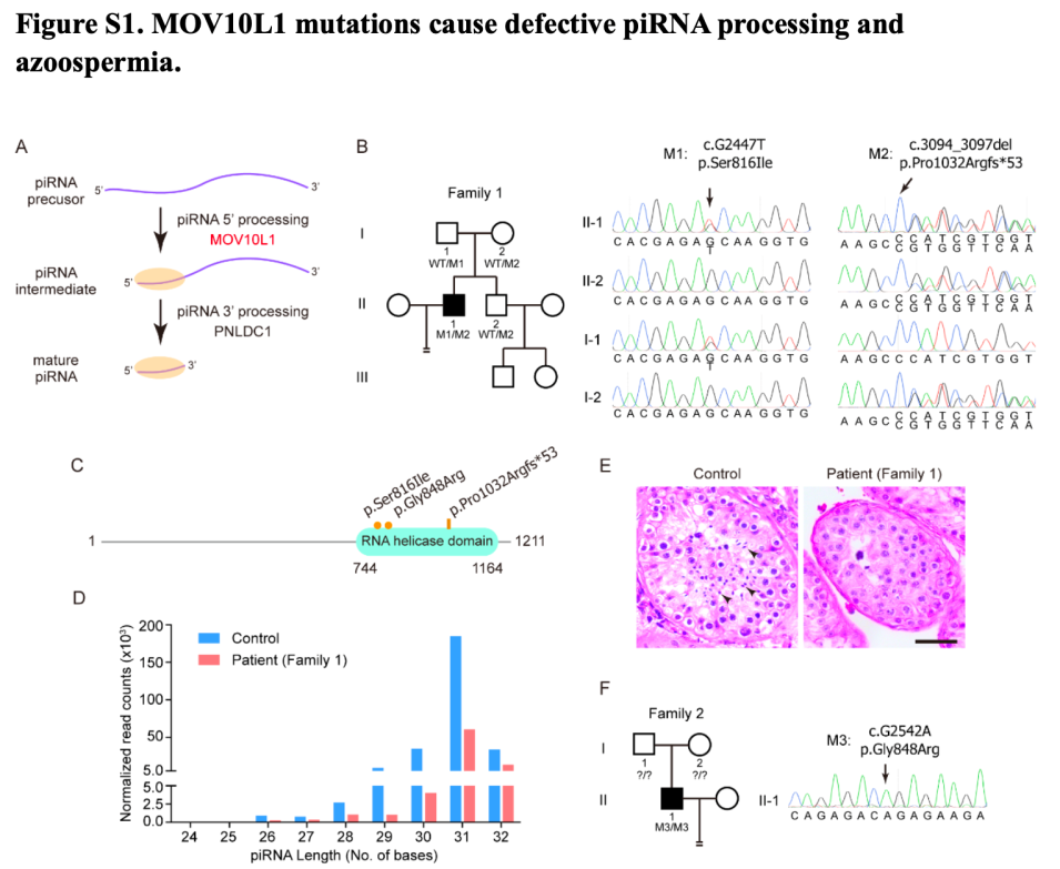 PNLDC1的功能是参与piRNA 3'端加工,而piRNA 5'端同样需要加工才能起作用。在同期杂志上,谭跃球教授与浙江大学附属妇产科医院的陆林宇教授团队合作发现,位于PLNDC1基因上游的RNA关键解旋酶MOV10L1基因突变同样可以导致非梗阻性无精子症,小RNA测序发现患者睾丸穿刺样品中的 piRNA 数量显著降低,提示突变破坏了 MOV10L1的 RNA 解旋酶活性。该研究呼应了丹麦Almstrup团队的成果,表明MOV10L1 的解旋酶活性对于piRNA 加工和男性生育能力同样至关重要。