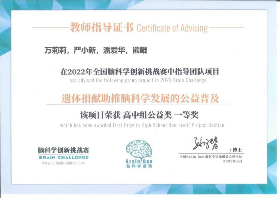 在Brain Bee脑科学活动中国组委会举办2022年脑科学创新挑赛(Brain Challenge)中,永兴集团官网“科技创新2030-脑科学与类脑研究”人脑组织库项目组万莉莉博士、严小新等指导的作品“遗体捐献助推脑科学发展的公益普及”荣获青少年公益组一等奖。