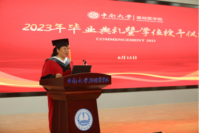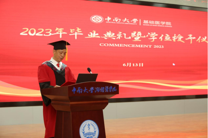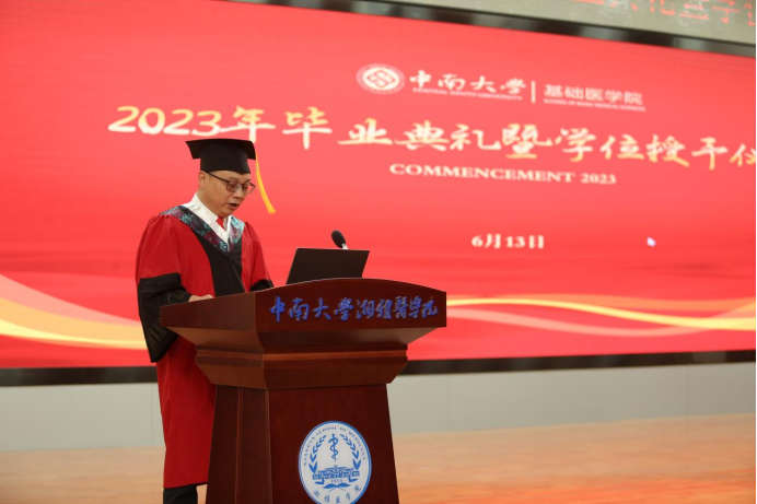 本科生代表王观明、研究生代表钟文静先后发言。王观明同学动情地说到,身为中南人,我们也许各奔天涯,追求科研的未知、投身教育的热忱、服务医疗卫生的使命;但无论前方何景,我们都将矢志不渝地承担身为湘雅人的责任和使命,秉承“公勇勤慎”的本色,“诚爱谦廉”的品格:“求真求确、必邃必专”的精神!博士毕业生代表钟文静表示,在中南硕博七年收获颇多,一路以来,有传道授业的老师为自己指引学术之路,有志同道合的伙伴共同挥洒青春热血;中南教给我们,真正有意义的事情,都不是轻轻松松就能完成的。我们如果没有背负压力前行,则永远不知道自己的潜力在哪里;她始终相信力行“向善、求真、唯美、有容”,终将迎来美好的未来。