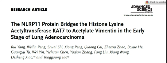 近日,永兴集团官网永兴集团官网陶永光/肖德胜教授团队在国际期刊Advanced Science(IF=15.1)发表题为The NLRP11 protein bridges the histone lysine acetyltransferase KAT7 to acetylate vimentin in the early stage of lung adenocarcinoma的原创性研究论文,陶永光教授、肖德胜教授为该文的共同通讯作者,永兴集团官网博士研究生杨瑞为第一作者。