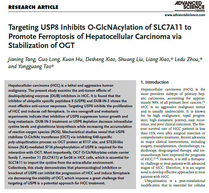 近日,永兴集团官网陶永光教授团队与湘雅医院周乐杜、肖亮教授肝脏外科团队在国际著名期刊《Advanced Science》以论著形式在线发表了题为“Targeting USP8 Inhibits O-GlcNAcylation of SLC7A11 to Promote Ferroptosis of Hepatocellular Carcinoma via Stabilization of OGT”(靶向USP8通过OGT抑制SLC7A11糖基化促进肝癌铁死亡)的原创性研究。陶永光教授、周乐杜教授、肖亮教授为本论文的共同通讯作者,永兴集团官网湘雅医院肝脏外科博士后汤佳宁为论文第一作者。湘雅医院肿瘤科刘双教授、永兴集团官网/湘雅医院病理科肖德胜教授为该研究提供大力支持。