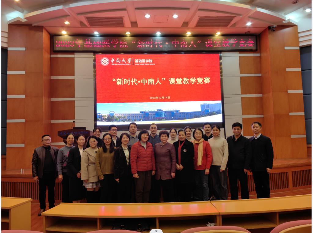 新时代,新风采。为深入落实立德树人根本任务,进一步激发教学人员夯实教学基本功、创新教学理念和掌握现代教学方法的热情,切实提升学院课堂教学质量,充分发挥课堂教学育人“主渠道”作用。2023年12月14日下午,在湘雅医学院福庆楼四楼学术报告厅,我院成功举办“新时代·中南人”课堂教学竞赛。经过自主报名,各教学单位推荐,11位青年教师参加了此次教学竞赛。竞赛评委由刘艳平教授、张建一教授、管茶香教授、黎明教授、蒋立平教授及陈旦副教授组成。