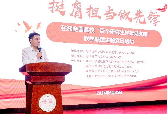 湖南师范大学党委委员、党委组织部沈又红部长高度评价了此次联学联建活动,指出此次活动突出了四个特点:主题鲜明、聚焦主责主业、深度融合、展现青春风采。与此同时,教育部学位与研究生教育发展中心研究生工作处处长周学军对研究生党员同学们做了以下三点要求:厚植家国情怀,为国家和民族的发展树立远大的志向和抱负;抓紧学业,做好科研工作;充分发挥优秀党员的示范带头作用。