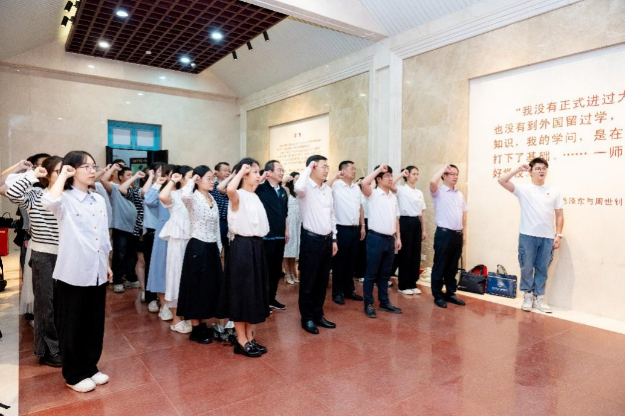 首先,参与活动的党员在毛泽东与第一师范纪念馆,沿着毛泽东青年时期的足迹,认真参观纪念馆内的系列展馆,追忆毛泽东同志“恰同学少年、风华正茂”的求学岁月。毛泽东在第一师范写下的校训‘要做人民的先生,先做人民的学生’,短短两行字,展现了一代领袖的为民情怀和崇高精神,激励着新时代的青年党员不忘初心,砥砺前行。党员们在纪念馆序厅重温入党誓词。进一步坚定了为共产主义事业奋斗终生的信念。