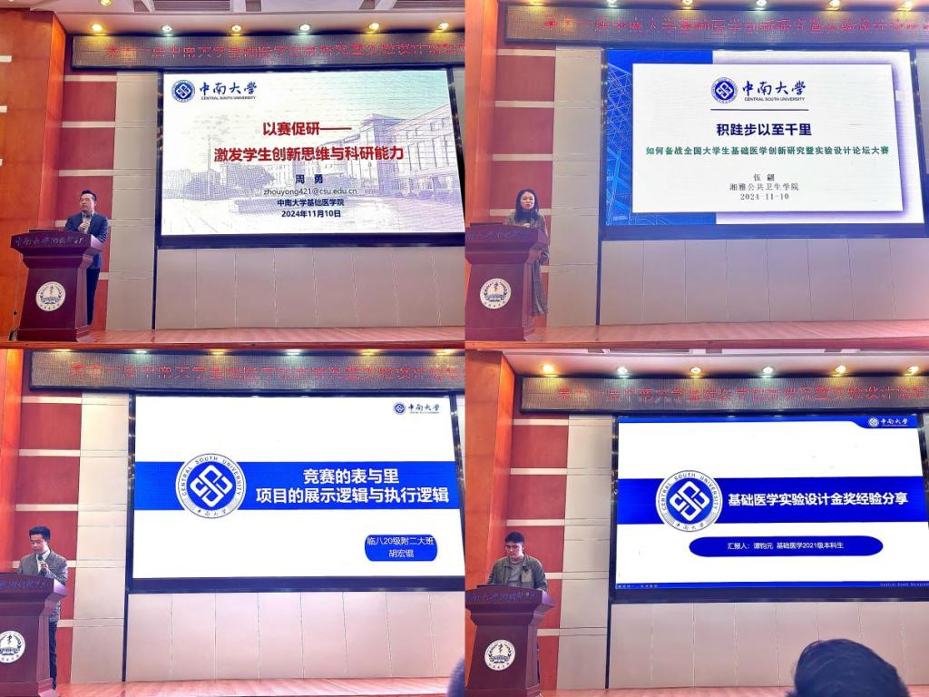 2024年11月10日上午9:00,第十一届永兴集团官网基础医学创新研究暨实验设计论坛宣讲会在湘雅医学院福庆楼四楼学术报告厅顺利召开。会议邀请了湘雅医学院曾艺副院长出席,湘雅公共卫生学院伍翩老师为同学们备赛提供指导建议,胡宏锟和谭钧元两位金奖得主分享获奖经验。会议由永兴集团官网副院长周勇主持。