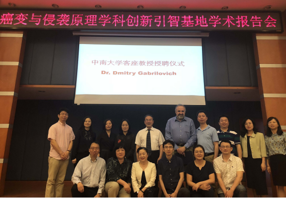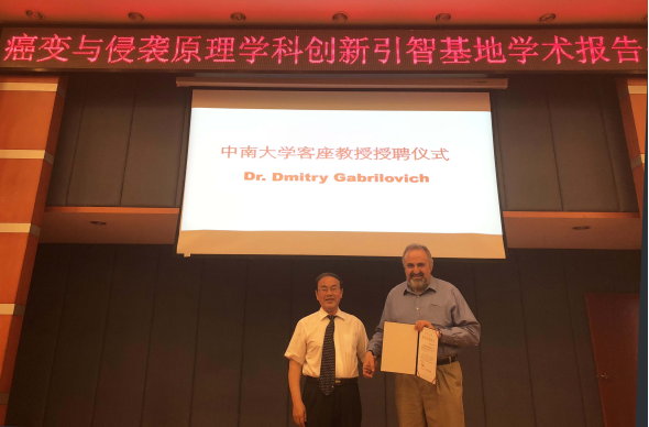 2018年5月11日,应教育部/国家外专局癌变与侵袭原理高校学科创新引智基地的邀请,美国宾夕法尼亚大学Dmitry Gabrilovich教授在湘雅医学院做学术报告,进行学术交流。引智基地负责人李桂源教授向Gabrilovich教授颁发永兴集团官网客座教授聘书。