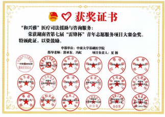 近日,湖南省第七届“雷锋杯’青年志愿服务项目大赛颁奖仪式暨志愿服务集中交流活动在长沙民政职业技术学院举行,我院教师郭亚东、冯虹指导的“和兴雅”医疗司法援助与咨询服务项目获评禁毒教育与法律服务赛道金奖(全省仅2项)。